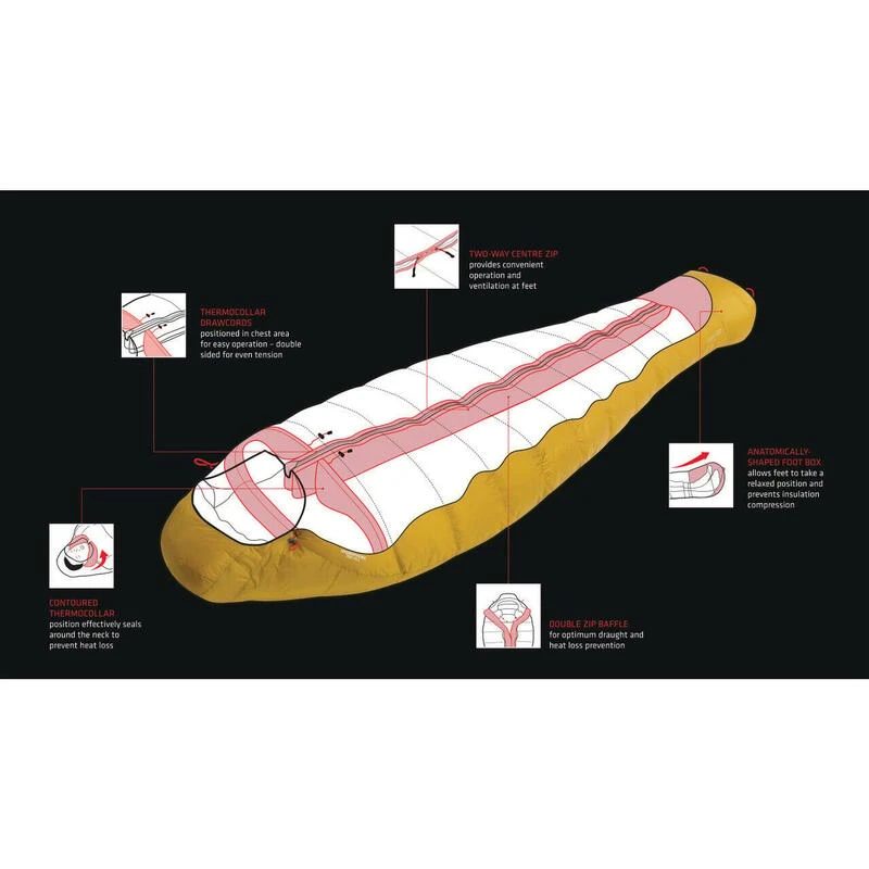 Sac de couchage en duvet hydrofuge. Plage de températures de -8°C à -15°C.